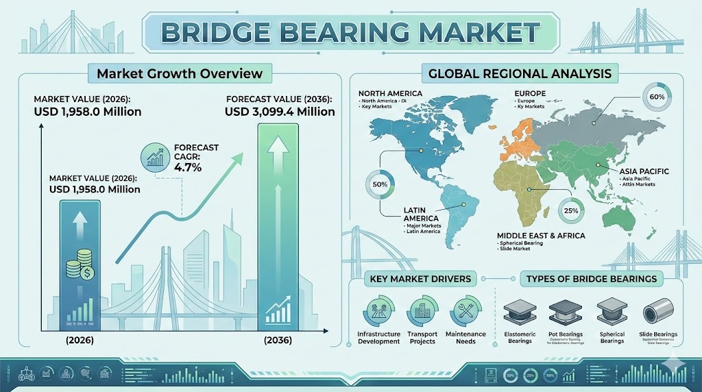 NEWARK, DE, UNITED STATES, April 2, 2026 /EINPresswire.com/ -- The global Bridge Bearing Market is witnessing steady expansion, projected to grow from USD 1,958.0 million in 2026 to USD 3,099.4 million by 2036, reflecting a CAGR of 4.7%. This growth trajectory is strongly supported by increasing infrastructure rehabilitation programs in developed regions and large-scale bridge construction projects across emerging economies.